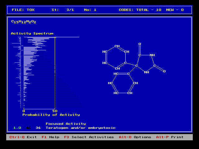 Компьютерную программу PASS, о которой рассказано в статье, использовали для предсказания биологической активности одного из противоэпилептических препаратов . Длина горизонтальных белых линий отражает прогнозируемую вероятность того или иного действия на организм (их рассматривается около сотни). Наболее вероятна, как и следовало ожидать, противоэпилептическая активность, но это вещество возможно является также канцерогеном и тератогеном.Например, выявление и изучение побочного действия новых лекарственных препаратов поглощает массу времени, денег и сил, прежде всего, потому, что таких эффектов может быть сколь угодно много. Проверить все возможности просто нереально, а, выделяя те, что кажутся наиболее вероятными или опасными, легко упустить из виду главного врага. Программы типа PASS уменьшают шанс такого "прокола", потому что неожиданный побочный эффект может обнаружить себя в предсказанном спектре активностей препарата.