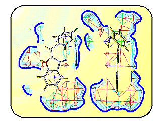 Сравнительный анализ структуры субстратов и ингибиторов позволяет составить представление о пространственном распределении различных свойств поверхности активного центра фермента. Здесь показаны две проекции условного портрета моноаминооксигеназы со связанным в нем ингибитором. Синий абрис и цветные полиэдры - оописывают контур участка связывания и расположение на нем электрических зарядов, гидрофобных участков, доноров и акцепторов протона. Такого рода модели часто с успехом используют при конструировании новых ингибиторов, если неизвестно истинное строение активного центра.Теперь, располагая "словесным портретом" рецептора, можно заняться подбором для него ранее неизвестных лигандов. Для этого нужно всего лишь брать одну за другой сотни тысяч известных органических молекул и примерять их к нашему "портрету", стараясь, чтобы плюс оказался против минуса, донор против акцептора и так далее. Не получилось, берем следующую... Мощь современных компьютеров и продуманность алгоритмов позволяют осуществить эту чудовищную по объему работу во вполне разумные сроки и отобрать относительно небольшое число соединений, заслуживающих прямой экспериментальной проверки на активность.